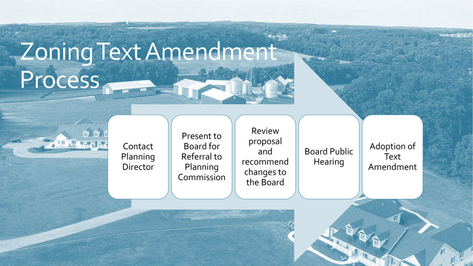 From time to time zoning code text is reviewed and modified to meet the changing market dynamics and to address other unforeseen, but necessary issues. These changes can be initiated by an applicant or the County. Applicants can initiate the process by contacting the Department of Planning and requesting a meeting with the Planning Director to discuss the proposed changes. The request is then brought before the Board of County Commissioners to refer to the Planning and Zoning Commission for their review and recommendation to the Board. The Planning and Zoning Commission determines if these changes are consistent with County Master Plan and other applicable plans and forwards these recommendations back to the Board of County Commissioners for a Public Hearing and subsequent Adoption (see the diagram below).