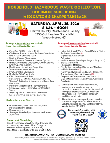 About: Carroll County residents can drop off dangerous household items listed below and shred sensitive documents from 8 a.m. until 12 noon. Residential only, not for commercial or farm use.
