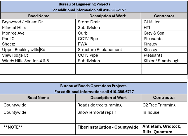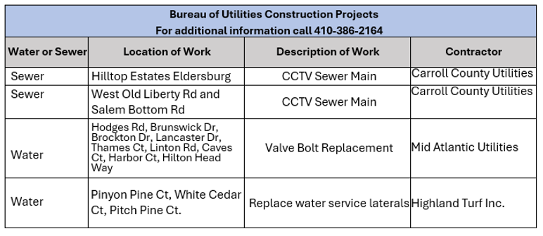 Carroll County Department of Public Works Road and Utilities Construction Project Schedule for the Week of March 16, 2026