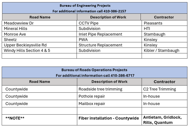 The Carroll County Department of Public Works advises drivers to allow extra time when traveling through construction work zones. Flagging operations may cause traffic delays and lane closures. We appreciate the public’s cooperation and patience with any traffic delays as construction and rehabilitation continue on the County’s roads and bridges.