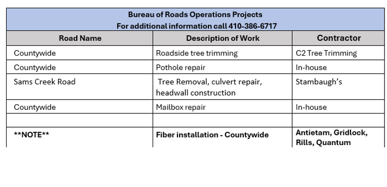 Carroll County Department of Public Works Road and Utilities Construction Project Schedule for the Week of February 9, 2026